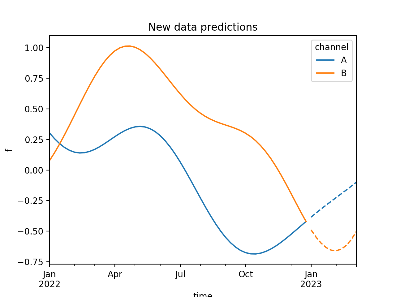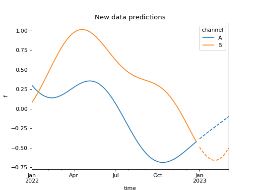 import numpy as np import pandas as pd import pymc as pm import matplotlib.pyplot as plt from pymc_marketing.mmm import HSGP from pymc_marketing.prior import Prior seed = sum(map(ord, "New data predictions")) rng = np.random.default_rng(seed) eta = Prior("Exponential", lam=1) ls = Prior("InverseGamma", alpha=2, beta=1) hsgp = HSGP( eta=eta, ls=ls, m=20, L=150, dims=("time", "channel"), ) n = 52 X = np.arange(n) dates = pd.date_range("2022-01-01", periods=n, freq="W-MON") coords = {"time": dates, "channel": ["A", "B"]} with pm.Model(coords=coords) as model: data = pm.Data("data", X, dims="time") hsgp.register_data(data).create_variable("f") idata = pm.sample_prior_predictive(random_seed=rng) prior = idata.prior n_new = 10 X_new = np.arange(n, n + n_new) new_dates = pd.date_range("2023-01-01", periods=n_new, freq="W-MON") with model: pm.set_data( new_data={ "data": X_new, }, coords={"time": new_dates}, ) post = pm.sample_posterior_predictive( prior, var_names=["f"], random_seed=rng, ) chain, draw = 0, 50 colors = ["C0", "C1"] def get_sample(curve): return curve.loc[chain, draw].to_series().unstack() ax = prior["f"].pipe(get_sample).plot(color=colors) post.posterior_predictive["f"].pipe(get_sample).plot( ax=ax, color=colors, linestyle="--", legend=False ) ax.set(xlabel="time", ylabel="f", title="New data predictions") plt.show()