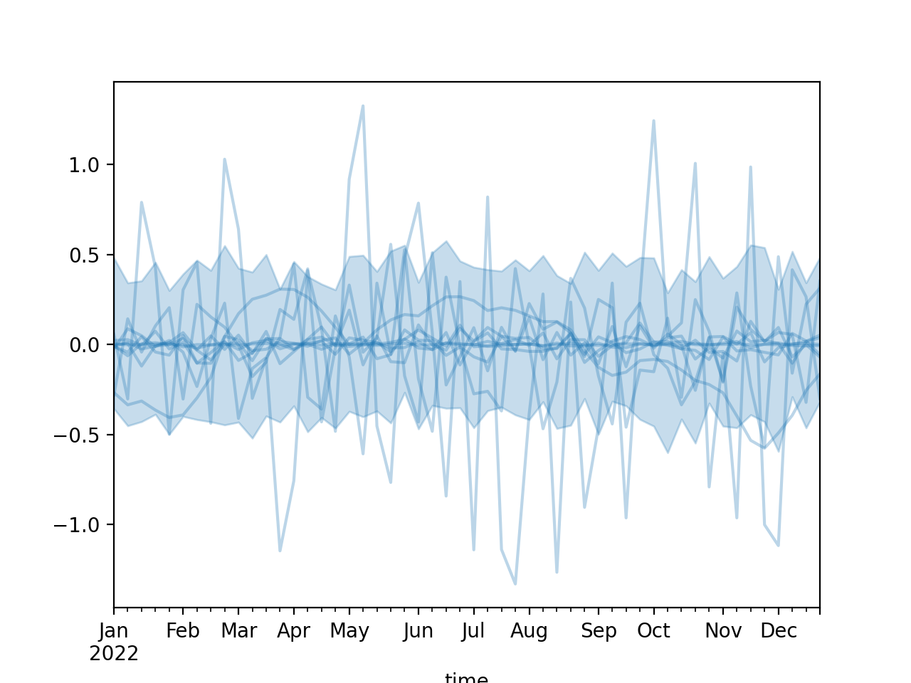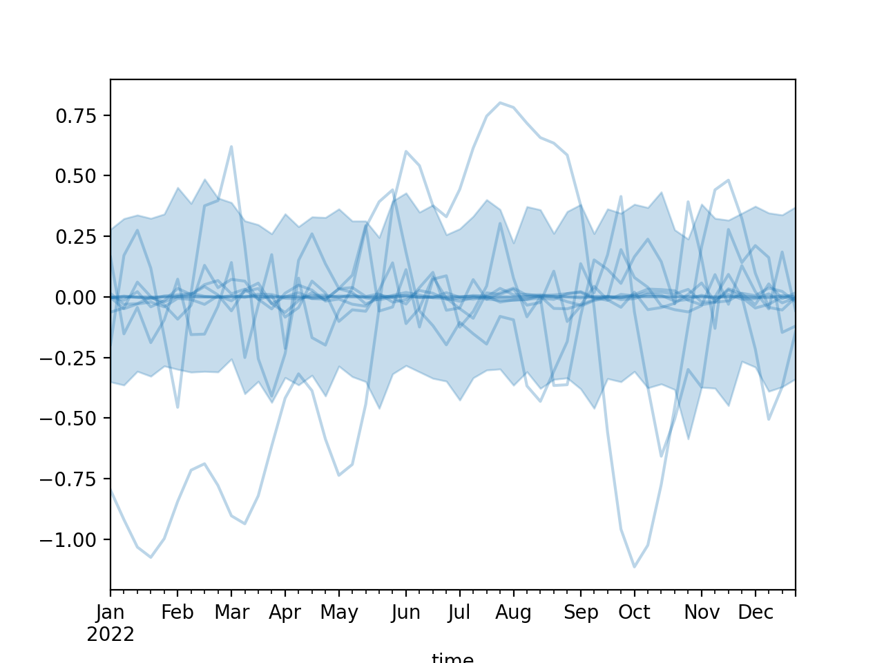 import numpy as np import pandas as pd import matplotlib.pyplot as plt from pymc_marketing.mmm import HSGP seed = sum(map(ord, "Change of covariance function")) rng = np.random.default_rng(seed) n = 52 X = np.arange(n) hsgp = HSGP.parameterize_from_data( X=X, cov_func="matern32", dims="time", ) dates = pd.date_range("2022-01-01", periods=n, freq="W-MON") coords = { "time": dates, } prior = hsgp.sample_prior(coords=coords, random_seed=rng) curve = prior["f"] hsgp.plot_curve(curve, sample_kwargs={"rng": rng}) plt.show()