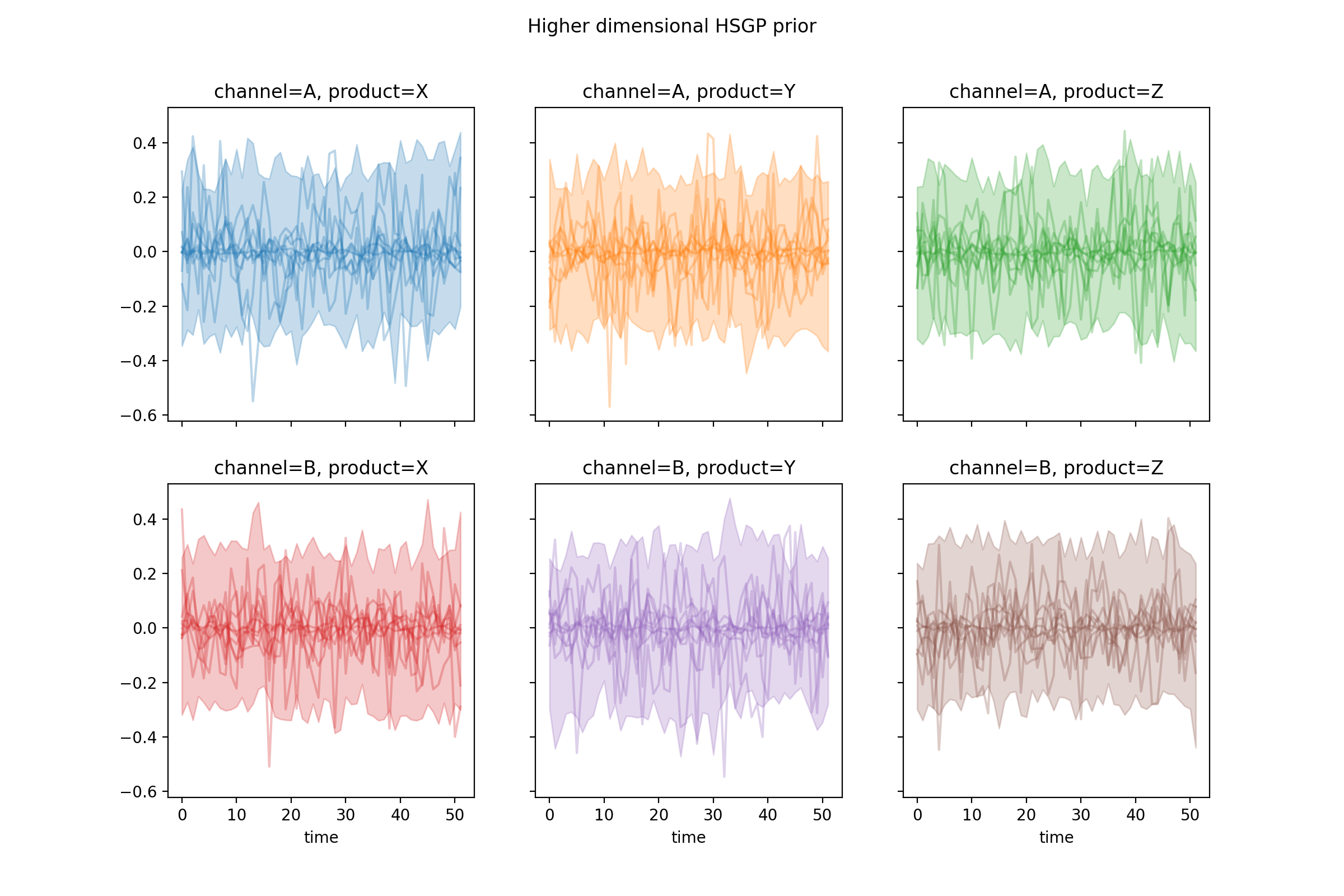 import numpy as np import pymc as pm import matplotlib.pyplot as plt from pymc_marketing.mmm import HSGP seed = sum(map(ord, "Higher dimensional HSGP")) rng = np.random.default_rng(seed) n = 52 X = np.arange(n) hsgp = HSGP.parameterize_from_data( X=X, dims=("time", "channel", "product"), ) coords = { "time": range(n), "channel": ["A", "B"], "product": ["X", "Y", "Z"], } prior = hsgp.sample_prior(coords=coords, random_seed=rng) curve = prior["f"] fig, _ = hsgp.plot_curve( curve, sample_kwargs={"rng": rng}, subplot_kwargs={"figsize": (12, 8), "ncols": 3}, ) fig.suptitle("Higher dimensional HSGP prior") plt.show()